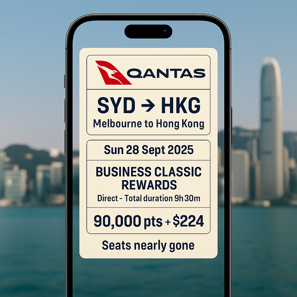 There’s direct Business reward space from Melbourne to Hong Kong on Sunday 28 September 2025 for 90,000 Qantas Points + $224. A clean, daytime hop straight into Victoria Harbour—nice way to save the cash and keep the lie-flat.